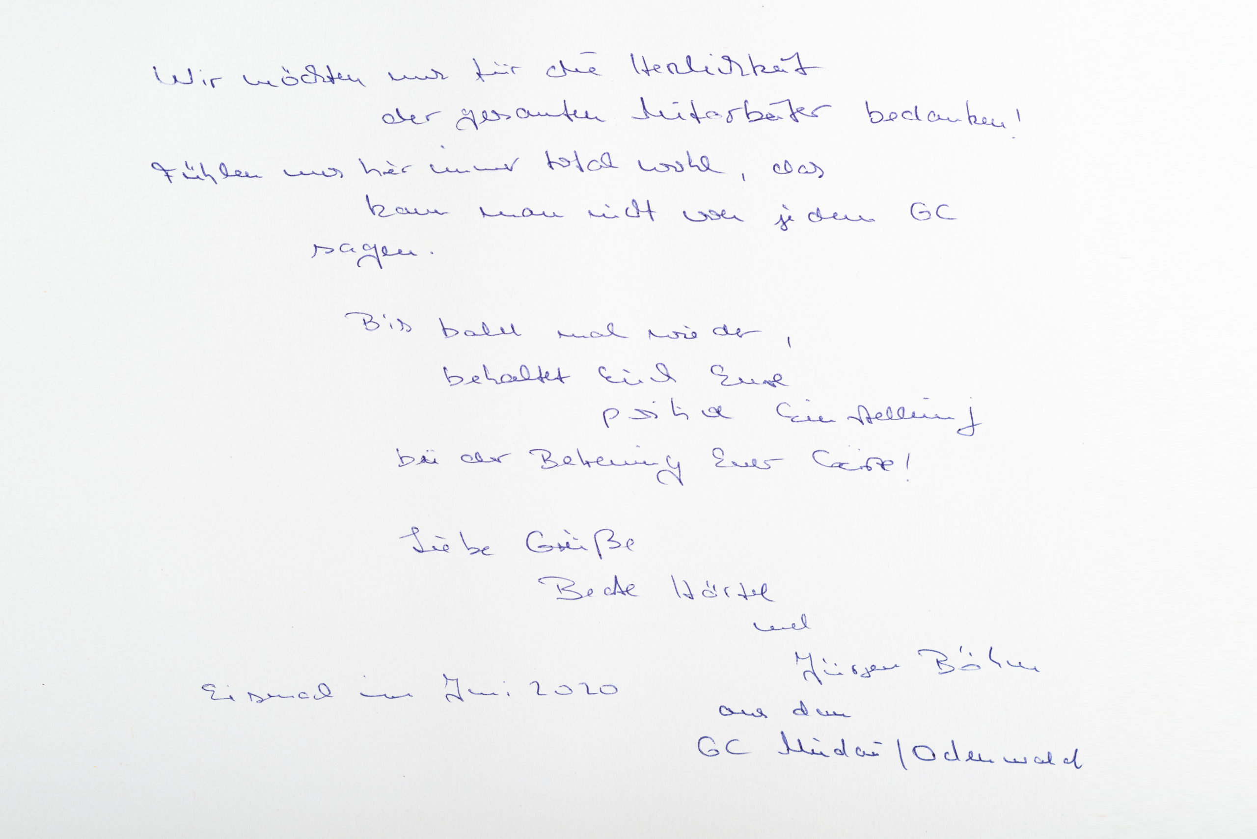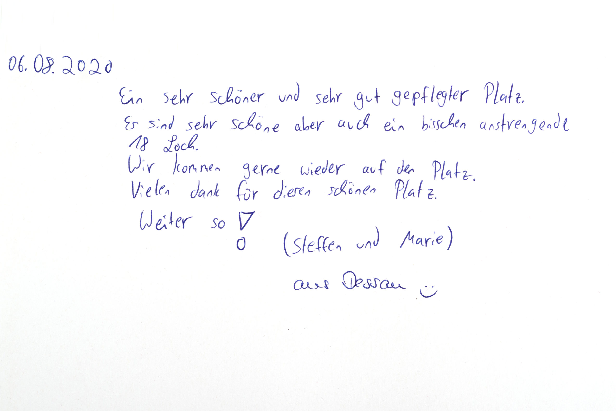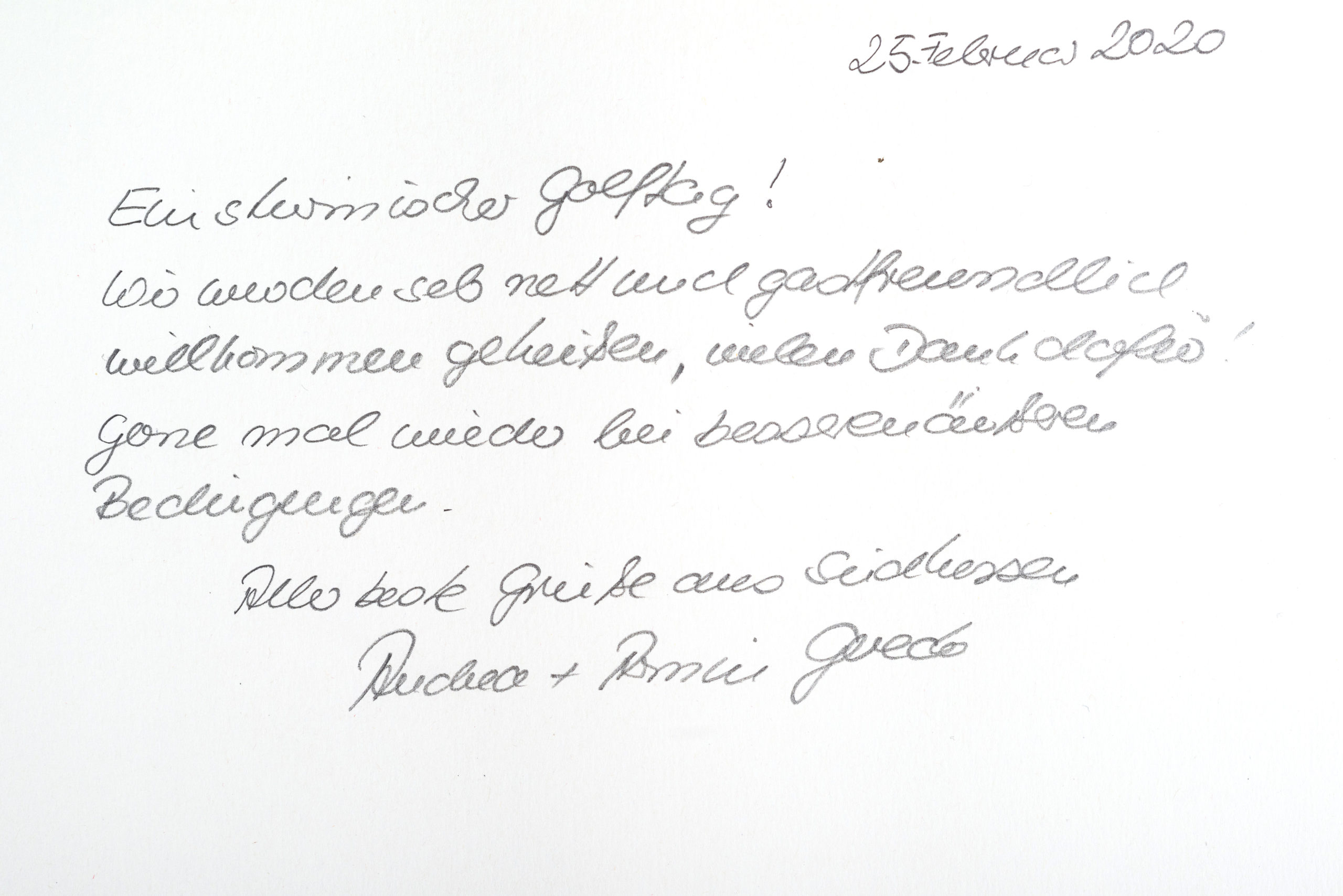 heute möchten wir einmal Dank sagen für das uns entgegengebrachte Vertrauen und die vielen positiven Rezensionen, die entweder bei Google, Facebook, Golf.de oder auch in unserem Gästebuch hinterlassen wurden. Dies zeigt uns, dass wir auf dem richtigen Weg sind. Auch wenn es garantiert noch einiges zu verbessern gibt, so haben wir zumindest eins erreicht, dass der überwiegende Teil unserer Gäste und Mitglieder sich bei uns wohl und gut aufgehoben fühlt. Da noch nie so viele positive Äußerungen wie in diesem Jahr in unser ausliegendes Gästebuch geschrieben wurden, haben wir Tobias Kromke gebeten, diese einmal abzufotografieren, um sie Euch auch mal auf diesem Weg vorstellen zu können. Hierfür unseren herzlichen Dank an Tobias Kromke! Das Geschriebene gibt den Weg für die kommenden Jahre vor. Ob Mitglied oder Gast, jeder soll sich hier wie zu Hause fühlen und von allen Verantwortlichen und Angestellten den Eindruck vermittelt bekommen, dass ein jeder Aufenthalt im Wartburg-Golfpark etwas Besonderes ist. Das ist unser Anspruch, unsere Aufgabe und unser Ziel. Sollten Sie einmal nicht dieses Gefühl haben, dann teilen Sie es uns bitte mit, denn nur so können wir lernen, uns stätig weiterentwickeln und das Niveau hochhalten.